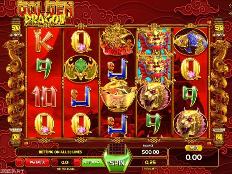 O Golden Dragon Slot apresenta o Palácio do Imperador em um formato de grade 5 × 4. Existem 50 linhas de pagamento para trabalhar, além de vários recursos úteis. Os recursos disponíveis incluem o recurso Golden Dragon e o Free Spins.