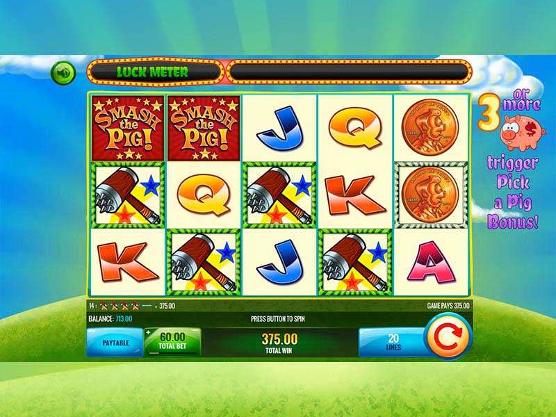 Quando você abrir o jogo de porco, jogará em um fundo verde e ensolarado. Há um "medidor de sorte" na parte superior da tela, que é preenchido quando você faz combinações vencedoras apropriadas simultaneamente enquanto a reproduz. Esse recurso permite ganhar créditos aquosos da boca e recompensas de bônus. O botão PayTable está presente no lado inferior esquerdo da tela. Ao clicar nele, você conhecerá os valores e limitações simbólicos do slot do cassino.