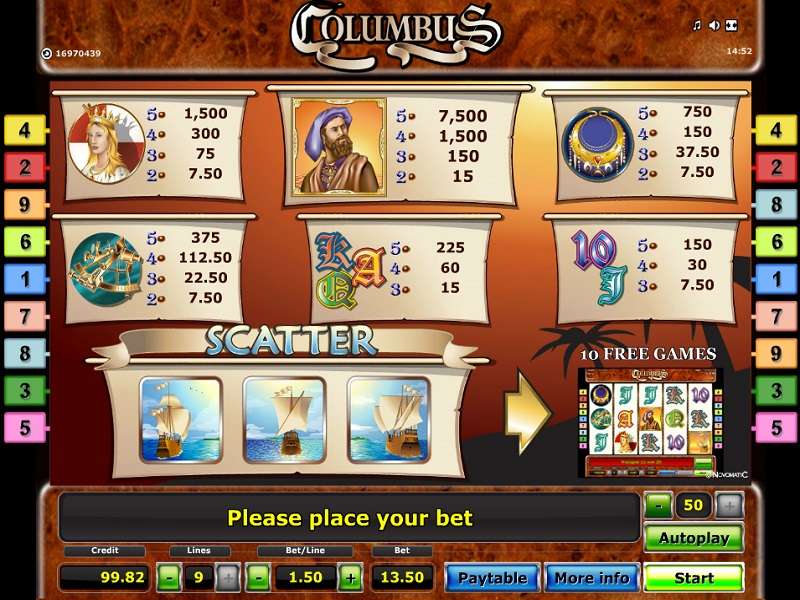 Columbus é um jogo bastante convencional desse tipo; tem cinco rolos e nove linhas de pagamento, que você pode usar todos (em uma participação mais alta) ou optar por jogar apenas em vários deles. A aposta máxima que você pode fazer ao jogar o slot de cassino do Columbus on -line é de € 100. O jogo também oferece alguns recursos de bônus, como giros gratuitos - você pode obter 10 deles se uma certa combinação surgir em seus rolos.