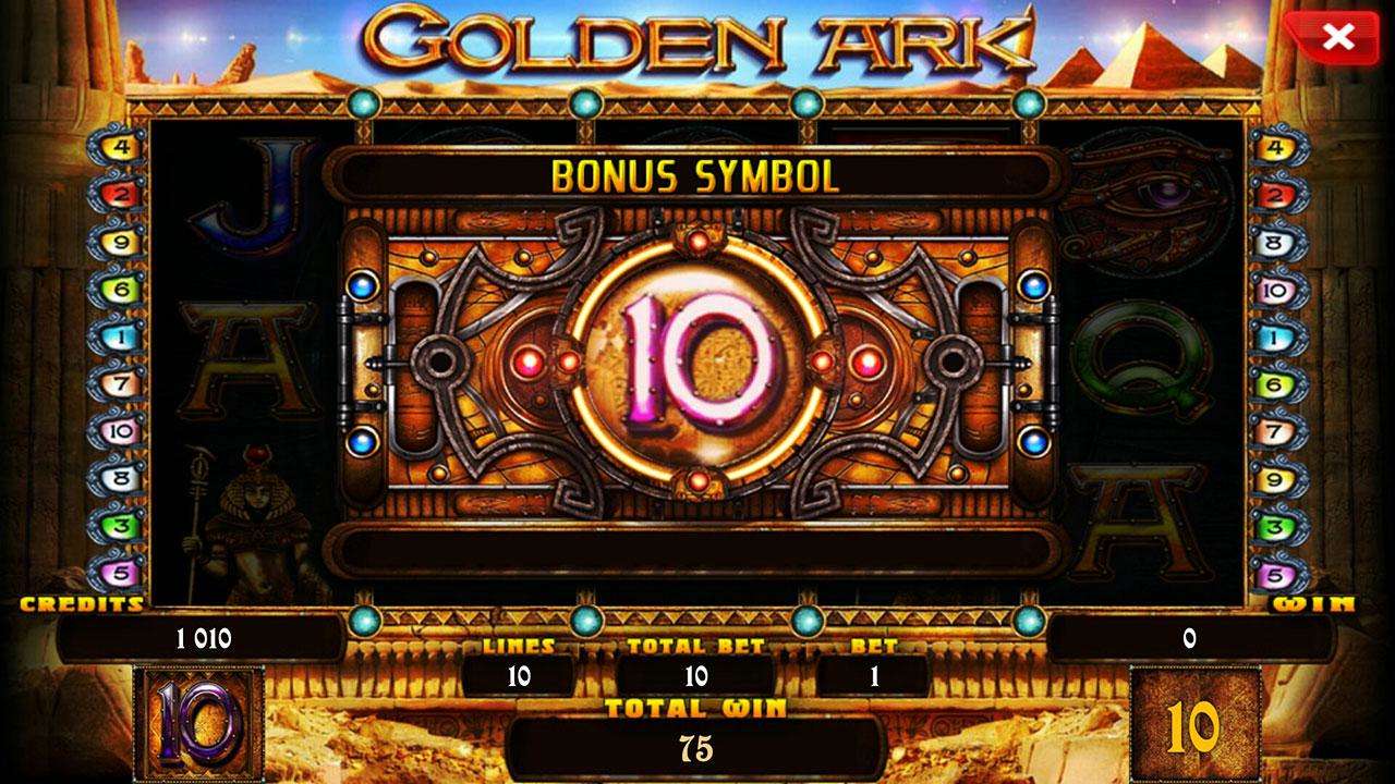Golden Ark é um jogo de 5 rumores após um explorador através das terras antigas do Egito. Ele vem com 10 linhas de pagamento e inclui vários símbolos, como o livro, o olho de Hórus, alguns deuses, o Explorer e os ícones de cartas de jogo padrão.